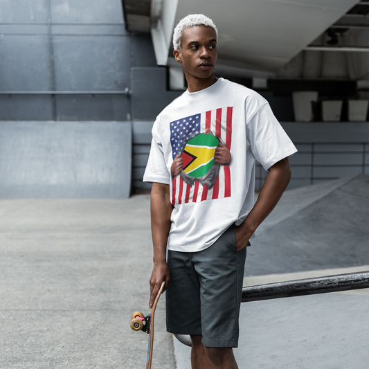 Guyana Flag + USA Flag Pride T-shirt | Guyanese + American Flag Rip 4th Of July | Funny Viral Latino Tees | Unisex - 4 Colors