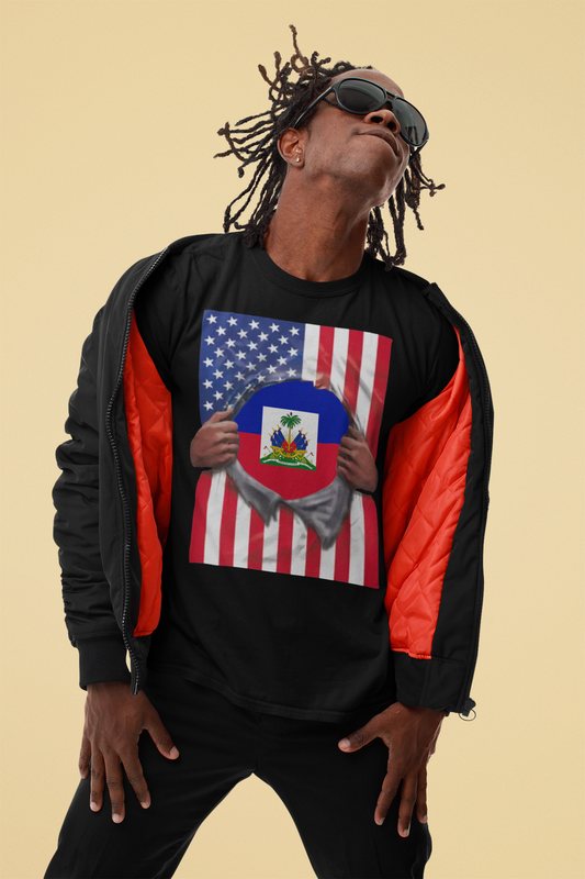 Haiti Flag + USA Flag Pride T-shirt | Haitian + American Flag Rip 4th Of July | Funny Viral Latino Tees | Unisex - 4 Colors