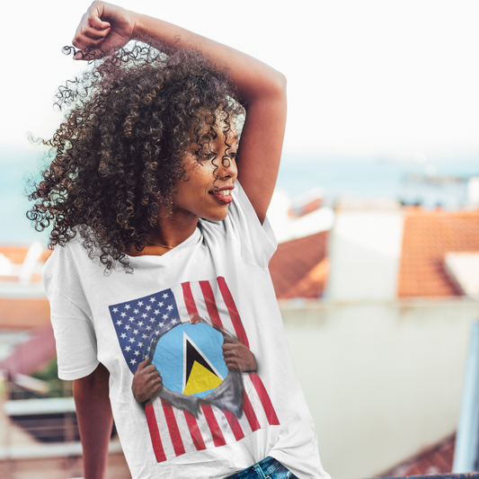 Saint Lucia + USA Flag T-shirt | St Lucian + American Flag Rip 4th Of July | Funny Latino Tees | 4 Colors