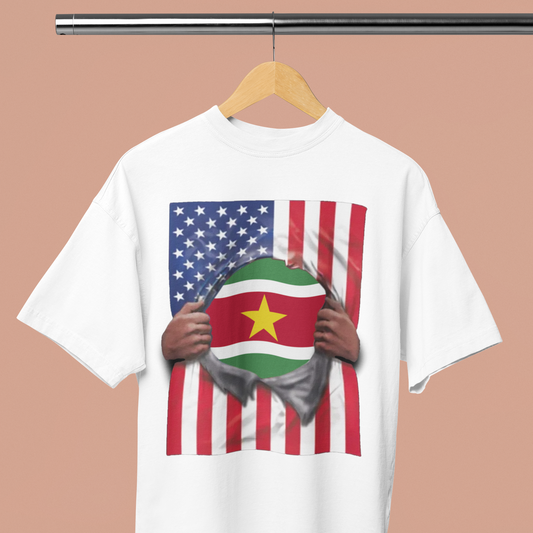 Suriname Flag + USA Flag Pride T-shirt | Surinamese + American Flag Rip 4th Of July | Funny Viral Latino Tees | Unisex - 4 Colors