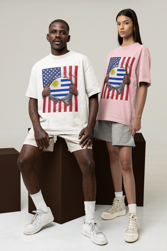 Uruguay Flag + USA Flag Pride T-shirt | Uruguayan + American Flag Rip 4th Of July | Funny Viral Latino Tees | Unisex - 4 Colors
