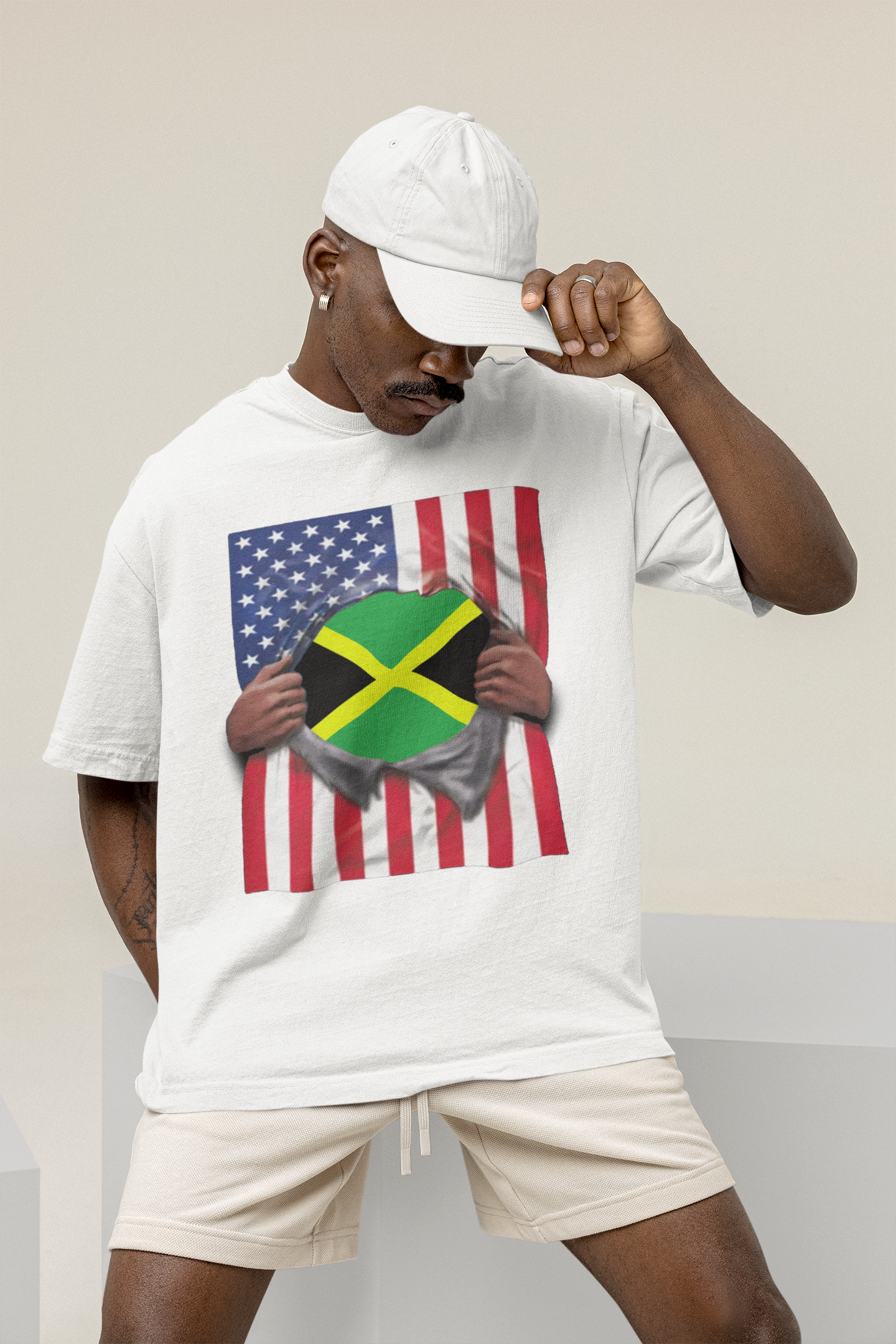 Jamaica Flag + USA Flag Pride T-shirt | Jamaican + American Flag Rip 4th Of July | Funny Viral Latino Tees | Unisex - 4 Colors