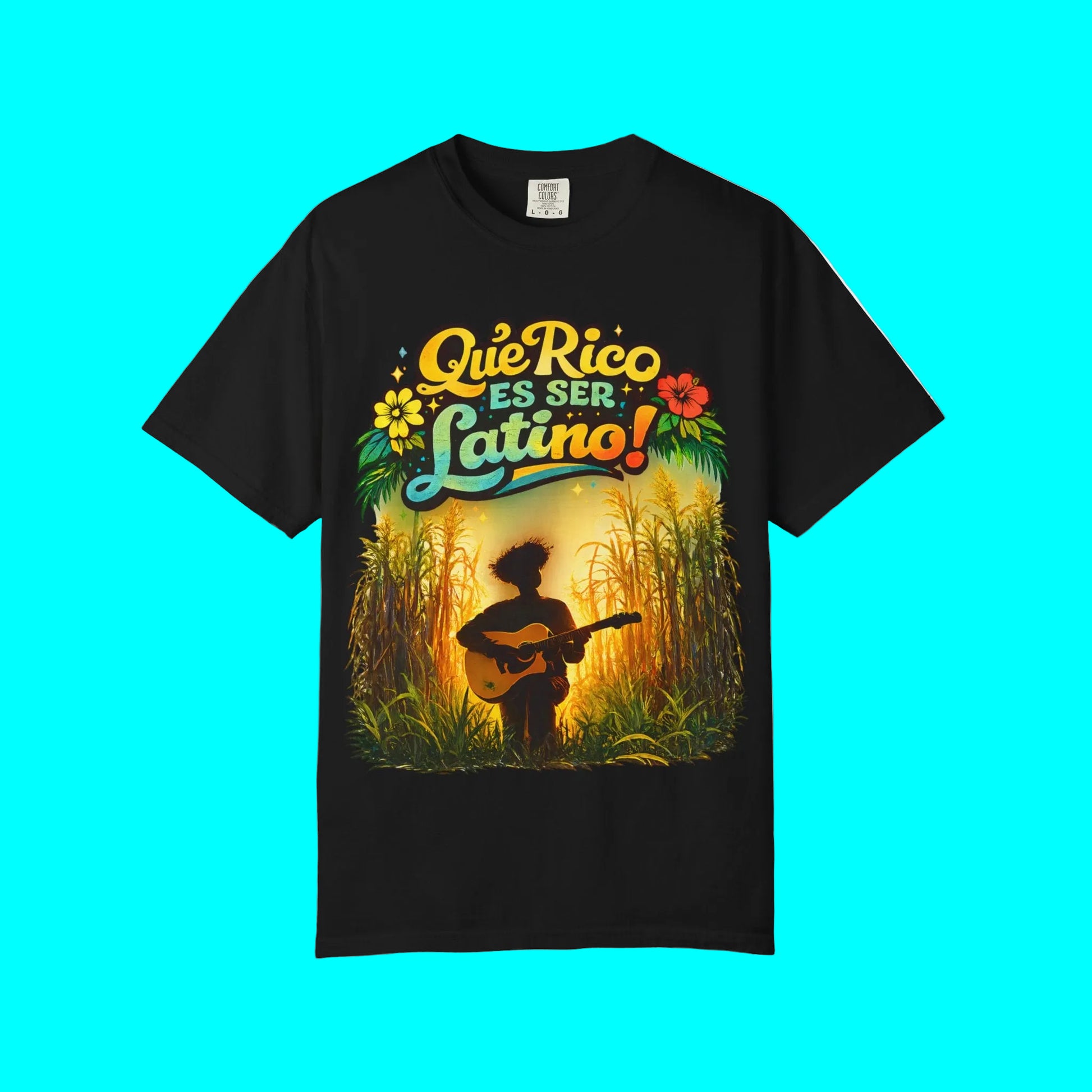 Features a bold “Qué Rico Es Ser Latino” design with a sugar cane field and Caribbean-influenced lettering — a vibrant expression of Latino identity and unity.