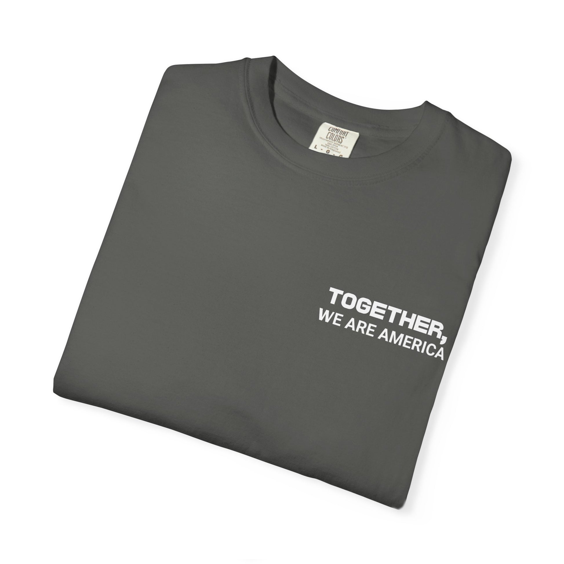 • MINIMAL FRONT, BOLD BACK – Clean chest print with “TOGETHER, WE ARE AMERICA” and a vibrant full-color flag grid on the back